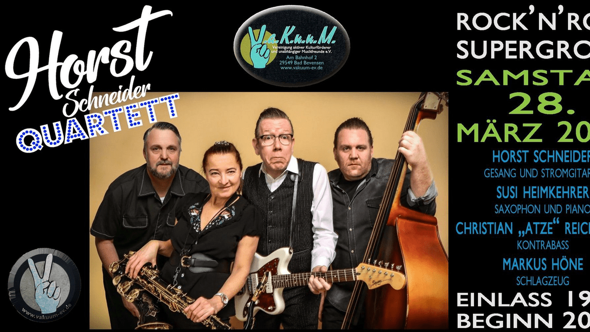 Das  Horst Schneider Quartett  besteht aus hervorragend ausgebildeten und hochmotivierten Musikern, die absolute Experten auf ihrem Gebiet sind. Dank ihrer langjährigen Erfahrung können sie jederzeit umfangreichen, erstklassigen Rock’n’Roll anbieten. Der Sound ist extrem tanzbar. Dazu gibt es unterhaltsame und teilweise haarsträubend beknackte Texte. Die Zeit ist reif für das  Horst Schneider Quartett ! Einlass 19:30 Uhr | Beginn 20:00 Uhr