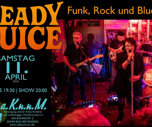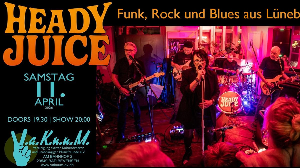 HEADY JUICE bringt druckvollen Groove in die Lüneburger Musikscene – funky, rockig, energiegeladen. Die fünfköpfige Band begeistert mit einer mitreißenden Mischung aus Funk, Rock und Blues nicht nur eingefleischte Musikfans und Tanzversessene. HEADY JUICE ist ein Statement – ein musikalischer Cocktail aus Druck, Groove und Spielfreude. Einlass 19:30 Uhr | Beginn 20:00 Uhr