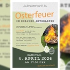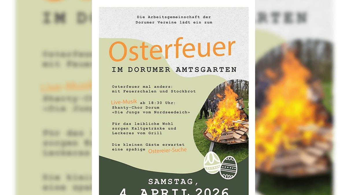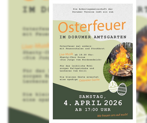 Osterfeuer im Dorumer Amtsgarten Am Samstag, den 04. April 2026, ab 17:00 Uhr veranstaltet die Arbeitsgemeinschaft der Dorumer Vereine ein Osterfeuer im Dorumer Amtsgarten. Mit Feuerschalen und Stockbrot sowie Kaltgetränken und Leckeres vom Grill. Für die kleinen Gäste gibt es eine Ostereier-Suche. Live-Musik ab 18:30 Uhr: Shanty-Chor Dorum „Die Jungs vom Nordseedeich“.