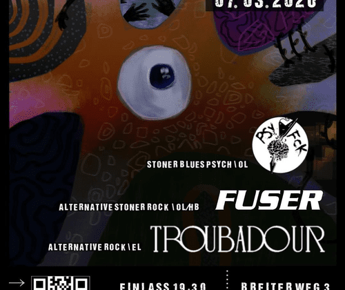 Am 07.03.2026 wird es laut, schwer und psychedelisch! Freut euch auf eine Nacht voller fuzzgetränkter Riffs, treibender Grooves und hypnotischer Sounds. 📅 Datum: 07.03.2026 🕢 Einlass: 19:30 Uhr 🎸 Beginn: 20:00 Uhr 💶 Eintritt: 12-15€ (zahl, was du kannst) 🎟️ VVK: juz.ticket2go.de Live auf der Bühne: Fuser (Oldenburg/Bremen) Alternative Stoner Rock mit Wurzeln tief in den 90ern: Grunge, Stoner, Indie und Psychedelic treffen auf prägnante Riffs, zweistimmigen Gesang und eine Mischung aus Härte, Melodie und Atmosphäre. Eigenkompositionen mit Haltung, Emotion und ordentlich Druck. PsyFck (Oldenburg) Instrumentaler Stoner/Blues/Psychedelic Rock im Power-Trio-Format. Experimentelle Sounds, ungerade Takte und ausufernde Improvisationen sorgen für hypnotische Klangreisen. Troubadour (Papenburg) Alternative/Doom Rock Trio mit kraftvollem Sound und rebellischem Spirit. Roh, energiegeladen und mit einer klaren Mission: Immer hustlen, niemals aufgeben. Kommt vorbei und erlebt einen Abend voller schwerer Sounds, vibrierender Atmosphäre und ehrlichem Live-Rock! 📸 Poster-Design: @schlaureralsdu