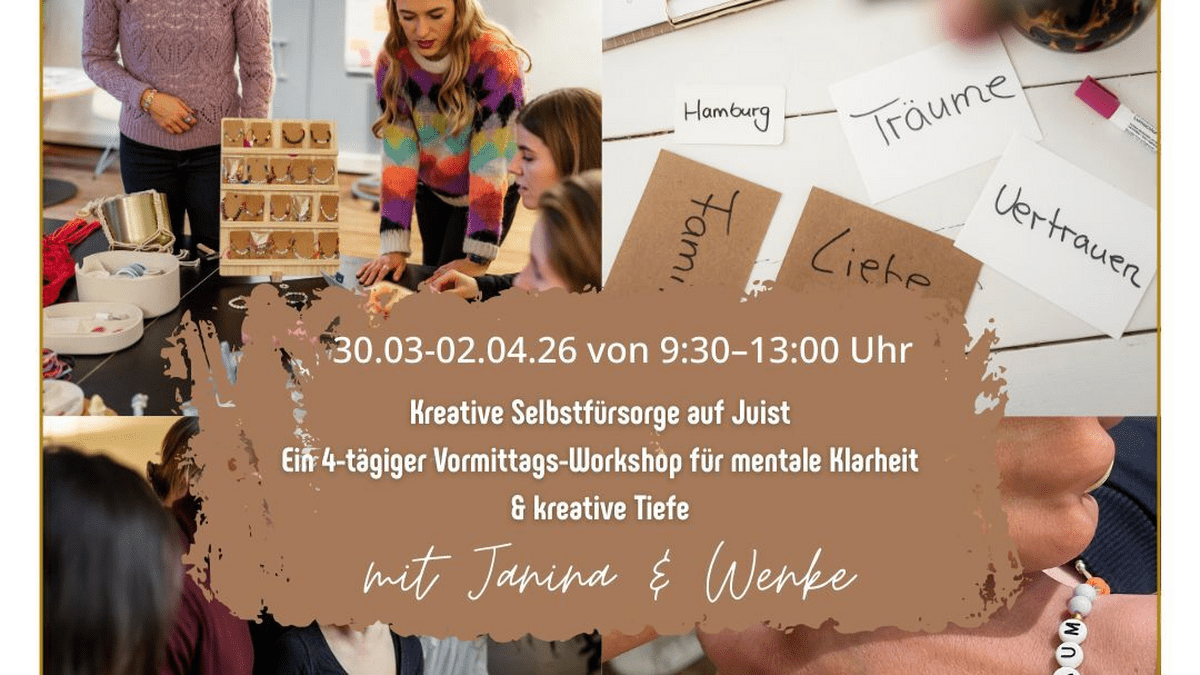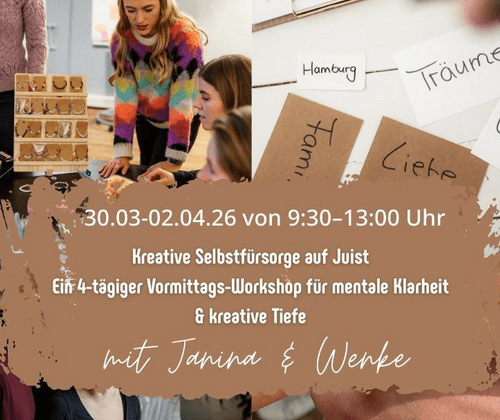 Kreative Selbstfürsorge – vier Tage für dich auf Juist Gönn dir eine bewusste Auszeit auf der Nordseeinsel Juist und verbinde kreative Prozesse mit mentaler Klarheit. In vier achtsamen Tagen tauchst du ein in Selbstfürsorge, Wertearbeit, Glaubenssatz-Transformation und intuitive Kreativität. Mit Meditationen, Inselimpulsen, Journalarbeit, Schmuckgestaltung, Malen und einer Kakao-Zeremonie schaffen wir Räume für Kopf, Herz und Bauch – damit du dich neu ausrichten, sortieren und stärken kannst. Ein Workshop, der wirkt – sichtbar, spürbar und nachhaltig. Kreative Selbstfürsorge auf Juist Ein 4-Tages-Workshop für mentale Klarheit & kreative Tiefe Auf der autofreien Nordseeinsel Juist laden wir dich ein, für vier Tage aus dem Alltag auszusteigen und dir selbst wieder näherzukommen. Kreative Selbstfürsorge verbindet mentale Techniken mit kreativen Ausdrucksformen – denn nur ein kleiner Teil unserer Gedanken läuft bewusst ab, während der größte Teil unbewusst wirkt. Genau hier setzen wir an. In einer kleinen Gruppe von maximal 25 Teilnehmer:innen begleiten wir dich durch vier aufeinander aufbauende Tage, die Körper, Geist und Gefühl gleichermaßen ansprechen. Tag 1 – Ankommen & Wahrnehmen Der erste Tag steht ganz im Zeichen des Ankommens. Mit Meditationen und Traumreisen eröffnen wir den Raum, gefolgt von sanften Achtsamkeitsübungen und Impulsen auf der Insel – draußen am Strand und drinnen in geschützter Atmosphäre. Du erhältst ein Journal , das dich durch den Workshop begleitet und dir hilft, Gedanken sichtbar zu machen, zu sortieren und kreativ zu reflektieren. Kleine kreative Impulse unterstützen dich dabei, deine innere Welt klarer wahrzunehmen und auszudrücken. Tag 2 – Werte & kreative Verankerung Was ist dir wirklich wichtig? An diesem Tag arbeitest du mit einer tiefgehenden Werteübung , um deine inneren Leitlinien bewusst zu erkennen. Anschließend übersetzt du diese Werte in ein kreatives Symbol: Du gestaltest dein eigenes Schmuckstück oder einen Schlüsselanhänger – als sichtbaren Anker , der dich im Alltag immer wieder an deine Ausrichtung erinnert. Hier darf dein kreativer Ausdruck ganz frei sein. Tag 3 – Glaubenssätze & intuitives Malen Unsere Glaubenssätze prägen unser Denken und Handeln oft unbewusst. Du lernst Techniken kennen, um hinderliche, tief verankerte Gedankenmuster zu erkennen, aufzulösen und neu zu formulieren. Im Anschluss verstärken wir diesen Prozess durch intuitives Malen mit Acrylfarben – jenseits von richtig oder falsch, direkt aus dem Gefühl heraus. Ein kraftvoller Weg, innere Veränderungen zu verankern. Tag 4 – Integration: Kopf, Herz & Bauch Zum Abschluss widmen wir uns einer mentalen Technik, die dir hilft, deine Gedanken nachhaltig zu sortieren. Wir arbeiten mit dem inneren Dialog zwischen Kopf, Herz und Bauch und verbinden diese Arbeit mit einer Kakao-Zeremonie – als bewusstes Ritual für Integration, Klarheit und innere Verbindung. Weitere Informationen zum Workshop "Kreative Selbstfürsorge" auf Juist Organisatorisches Dauer: 4 Tage Termin : Mo., 30.03., - Do., 02.04.2026, jeweils von 09:30 Uhr bis 13:00 Uhr Ort : Im Haus des Kurgastes Preis: 439 € für den gesamten Workshop | Einzeltage : 165 € pro Tag (separat buchbar) Bitte buche dein Ticket vorab über unseren Webshop . Alternativ kannst du dein Ticket auf in unseren Tourist-Informationen vor Ort erwerben. Bitte beachte : Wenn du ein Wochenticket für den gesamten Workshop erwerben möchtest, wähle die Option des ersten Termins. Wenn du einzelne Tickets erwerben möchtest, klicke auf den jeweils betreffenden Termin. Dieser Workshop ist für dich, wenn du mentale Weiterentwicklung mit kreativen Methoden verbinden möchtest – sanft, tiefgehend und nachhaltig. Eine Insel. Vier Tage. Raum für dich.