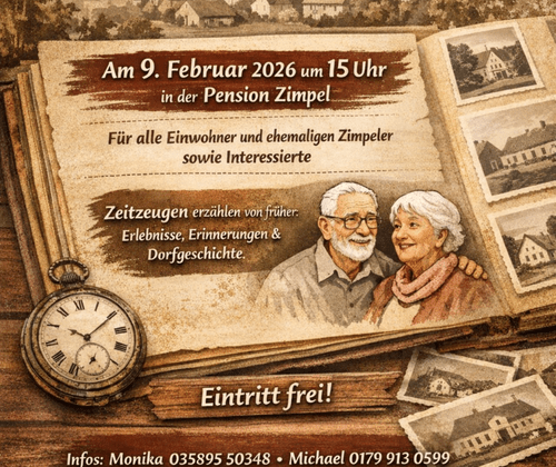 Ein Nachmittag für Erinnerungen, Erlebnisse und Dorfgeschichte. Jedes Dorf hat seine eigenen Geschichten - manche sind lustig, manche bewegend, und viele drohen über die Jahre in Vergessenheit zu geraten. Wir möchten die Vergangenheit von Zimpel von Zeitzeugen, bei Kaffee und Kuchen, wieder lebendig werden lassen.