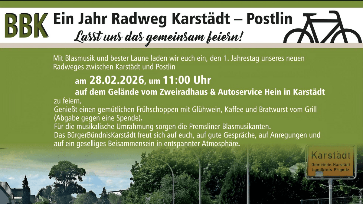Das BürgerBündnisKarstädt (BBK) lädt zu einem musikalischen Frühschoppen ein. Seit einem Jahr verbindet der Radweg Karstädt-Postlin wieder Menschen, Orte und Wege – ein schöner Anlass, um innezuhalten, zurückzublicken und gemeinsam ein paar gemütliche Stunden zu verbringen. Dieses Jubiläum möchten wir nutzen, um in entspannter Atmosphäre genau das zu tun, was unsere Region ausmacht, zusammenkommen, klönen und eine gute Zeit miteinander verbringen . Freuen Sie sich auf einen gemütlichen Frühschoppen in geselliger Runde mit wärmendem Glühwein , frischem Kaffee , Bockwurst, Bratwurst vom Grill und klassischen Schmalzstullen – bodenständig, lecker und für jeden ist etwas dabei. Für die passende musikalische Stimmung sorgen die Premsliner Blasmusikanten. Das BürgerBündnisKarstädt freut sich auf euch, auf nette Begegnungen, gute Gespräche und viele Anregungen – ganz ungezwungen und in familiärer Atmosphäre auf dem Gelände vom Zweiradhaus & Autoservice Hein in Karstädt, direkt am Radweg.