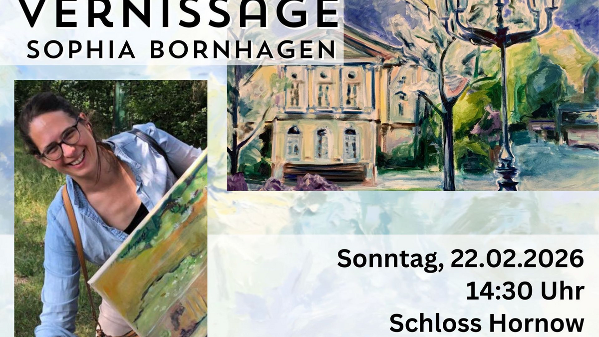 Sophia Bornhagen, freischaffende Malerin, Plastikerin und Kunsthistorikerin zeigt im Schloss Hornow gegenständliche Ölmalerei. Ihre figürlichen Darstellungen, Stillleben, landschaftlichen und architektonischen Motive nehmen dabei mittelbar Bezug auf Schloss und Park in Hornow sowie auf die Malerei Max Rabes. Die im Harz geborene Künstlerin ist Teil der “rosagarage” im Wendland, des KUNSTWERK Uelzen e.V. und Mitglied des BBK Berlin. Für die musikalische Umrahmung sorgt der Pianist und Entertainer Andreas Gundlach. Für das leibliche Wohl ist ebenfalls gesorgt.
