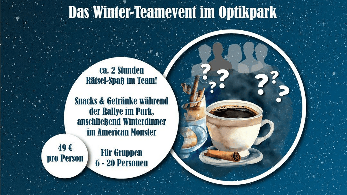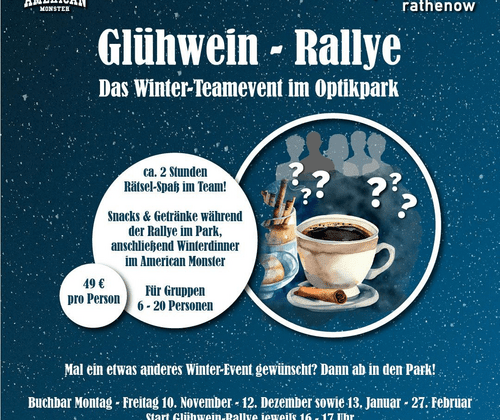 Die Optikpark-Glühwein-Rallye verspricht einen winterlichen Teamabend voller Überraschungen! Es erwarten Euch ca. 2 Stunden Rätsel-Spaß im nachtdunklen Optikpark - ein Erlebnis der besonderen Art! Los geht es zwischen 16 und 17 Uhr! Spannende und lustige Aufgaben warten auf Euer Team und versprechen den einen oder anderen Lacher! Aber auch Wissen und Teamgeist sind gefragt. Snacks & Getränke während der Rallye belohnen Euer Wissen! Beschwipst und gut gelaunt geht es anschließend zum Winterdinner in das American Monster! Lasst den Abend bei einem schönen gemeinsamen Essen ausklingen und leitet die Winterzeit ein. Für Gruppen ab 6 bis 20 Personen!