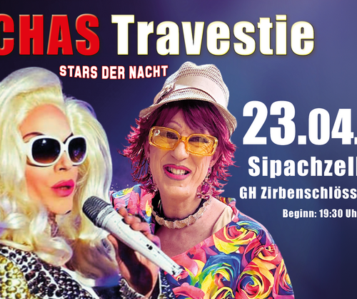 Ein Abend mit den Stars der Nacht - Travestie Sascha bedeutet: unvergessliche Stimmung, gemeinsanes Lachen und pure Freude! Showtime der extra Klasse im Zirbenschlössl in Sipachzell am 23.April 2026 um 19.30h ist Beginn und ab 18h gibt es ein 3 Gänge Menü Wahlweise zum Eintritt!