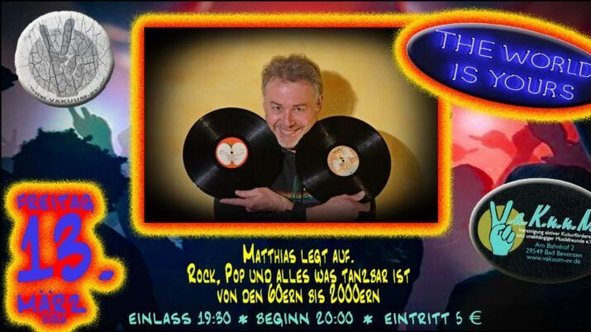 DJ Matthias versorgt die tanzende Menschenmenge mit besten Tracks und feinstem Groove: Genau so umwerfend, wie bei unserem jährlichen Weihnachtskneipenabend! Es wird Rock, Pop und alles, was tanzbar ist von den 60ern bis zu den 2000ern geben - viel Bekanntes, einiges lange nicht mehr gehörtes und das ein oder andere überraschende aus der wie immer gut „geölten“ Soundanlage des Vakuums! Matthias und das VaKuuM-Team freuen sich auf euch. LET’S BOOGIE ! Einlass 19:30 Uhr | Beginn 20:00 Uhr