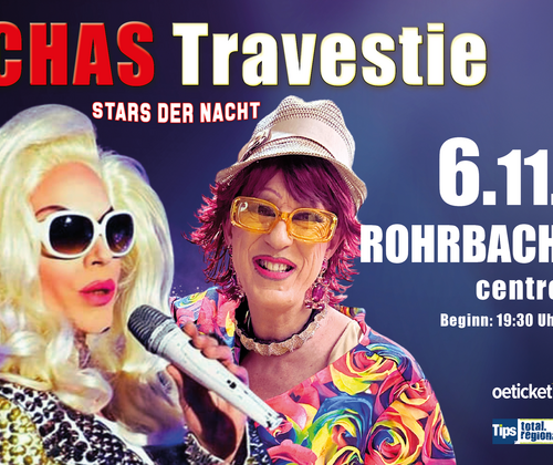 Stars der Nacht-Travestie Showtime ist angesagt am 6.Nov. 2026 um 19.30h centro Rohrbach-Berg! Künstler verwandeln sich in verschieden Stars und parodieren Sie auf Ihre weise in aufwendigen Kostüme-Outfits. Comedy und eine Revue der Sonderklasse werden alle Besucher begeistern. Sascha Travestie ist ein Begriff auf den Showbühnen. Er wir auch in Rohrbach im centro die Bühne mit seinen Künstlern ins beben, verzaubern bringen. Es wird ein Abend mit Staunen, Lachen, Schmunzeln und Begeisterung. Diese Show ist nicht nur eine Hommage an der glorreichen Stars, sondern auch ein Spektakel der Travestie-Unterhaltung.