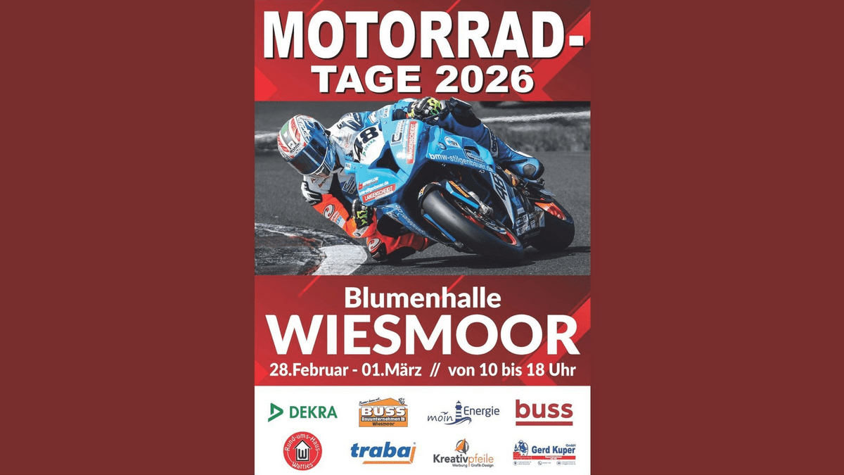📅 28.02. – 01.03.2026 | ⏰ 10:00–18:00 Uhr 📍 Blumenhalle Wiesmoor Zwei Tage rund um Motorräder, Quads und Biker-Kultur: aktuelle Modelle, Zubehör, Szene-Treff und Benzingespräche in besonderem Ambiente. 🎟 Eintritt: 6 € | Kinder bis 14 Jahre frei