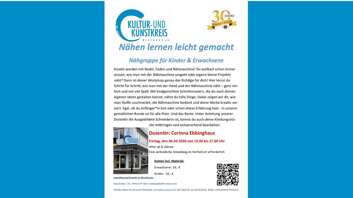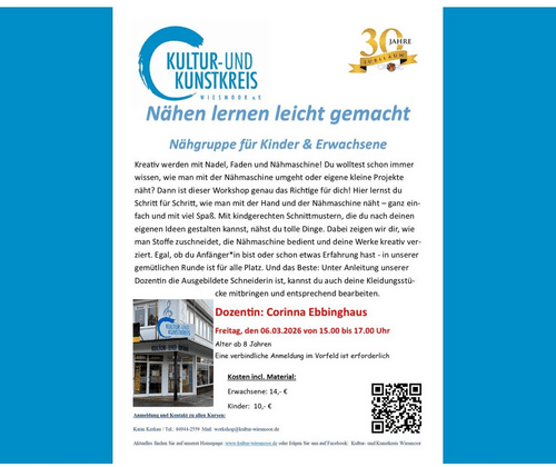 Nähgruppe für Kinder & Erwachsene Kreativ werden mit Nadel, Faden und Nähmaschine! Du wolltest schon immer wissen, wie man mit der Nähmaschine umgeht oder eigene kleine Projekte näht? Dann ist dieser Workshop genau das Richtige für dich! Hier lernst du Schritt für Schritt, wie man mit der Hand und der Nadel näht - ganz einfach und mit viel Spaß. Mit kindergerechten Schnittmustern, die du nach deinen eigenen Ideen gestalten kannst, nähst du tolle Dinge. Dabei zeigen wir dir, wie man Stoffe zuschneidet, die Nähmaschine bedient und deine Werke kreativ verziert. Egal, ob du Anfänger in bist oder schon etwas Erfahrung hast - in unserer gemütlichen Runde ist für alle Platz. Und das Beste: Unter Anleitung unserer Dozentin die Ausgebildete Schneiderin ist, kannst du auch deine Kleidungsstücke mitbringen und entsprechend bearbeiten.  Dozentin: Corinna Ebbinghaus Alter ab 8 Jahren Eine Verbindliche Anmeldung im Vorfeld ist erforderlich Kosten incl. Material: Erwachsene 14€ Kinder 10€ Anmeldung und Kontakt zu allen Kursen: Karin Kerkau/ Tel.: 04944 2559 Mail: workshop@kultur-wiesmoor.de Aktuelles finden Sie auf unserer Homepage: www.kultur-wiesmoor.de oder folgen Sie uns auf Facebook: Kultur- und Kunstkreis Wiesmoor
