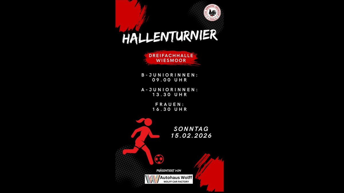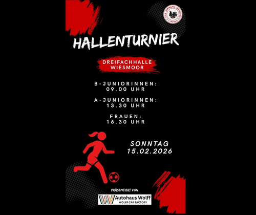 Am 15.02. ab 09.00 Uhr warten in der Dreifachhalle spannende Spiele der B-Juniorinnen, der A-Juniorinnen und der Frauen auf euch! Neben dem Platz gibt es eine durch die Mannschaften zur Verfügung gestellte Verpflegung. Der Erlös kommt den Juniorinnen und Frauen des VfB Germania Wiesmoor zugute. Der Eintritt ist kostenlos. Wir freuen uns auf euch!