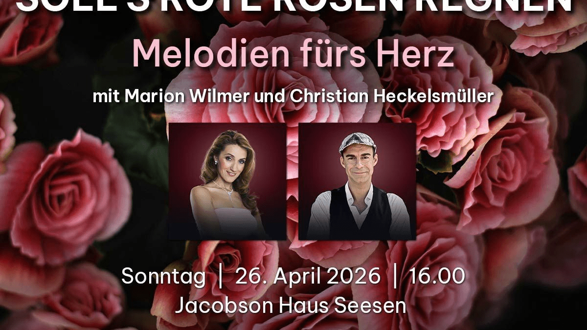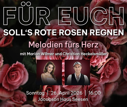 Tauchen Sie ein in eine musikalische Reise voller Sehnsucht, Liebe und zeitloser Klassiker. Mit berührendem Live-Gesang und einfühlsamer Klavierbegleitung bringen wir die schönsten Lieder direkt in Ihr Herz. Freuen Sie sich auf große Chansons, gefühlvolle Balladen und unvergessliche Melodien – von Heintje bis Caterina Valente, von Reinhard Mey bis Roland Kaiser. Und natürlich darf „Für mich soll’s rote Rosen regnen“ nicht fehlen – ein Lied, das wie kein anderes für Hoffnung, Gefühl und Lebensfreude steht. Ein Konzert, das unter die Haut geht – stimmungsvoll, charmant und voller Gefühl. Lassen Sie sich verzaubern von einer Show, die berührt und noch lange nachklingt. »Für euch soll es rote Rosen regnen – Melodien fürs Herz« – Musik, die mitten ins Herz trifft.