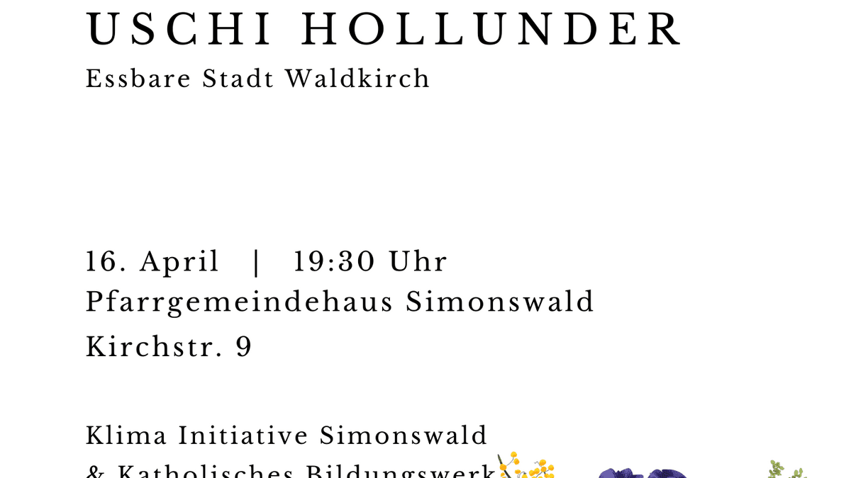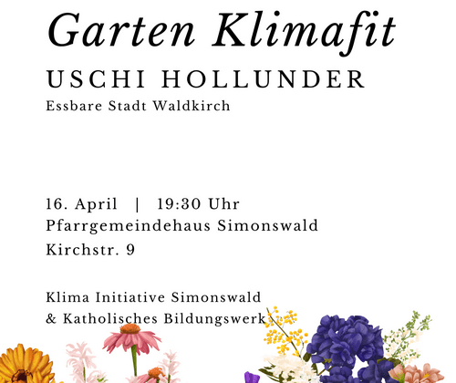 Zukunftsfestes Gärtnern mit Uschi Hollunder. Die Leiterin des Mitmachgartens in Waldkirch gibt Tipps für klimagerechtes Gärtnern und viele anschauliche Einblicke aus ihrer Praxis. Wie erhalten wir die lebensnotwendige Biodiversität und gewinnen dabei auch noch wertvolle Lebensmittel aus dem eigenen Anbau? Statt langweiligem artenarmem Rasen hat Uschi Hollunder einige Ideen im Gepäck. Also Ärmel hochgekrempelt und rein in die Materie! Ein Vortrag in Zusammenarbeit der Klima Initiative Simonswald und dem Katholischen Bildungswerk. Eintritt auf Spendenbasis.