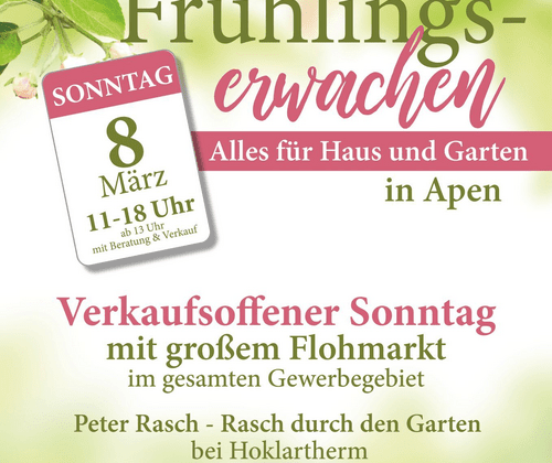 Zum Frühlingserwachen erwarten Sie die ortsansässigen Geschäfte und Aussteller aus der hiesigen Umgebung mit tollen Angeboten. Desweitern sind Hobbyhandwerker dabei und der große Flohmarkt zieht sich wieder quer durch das Gewerbegebiet. Für das leibliche Wohl ist gesorgt!