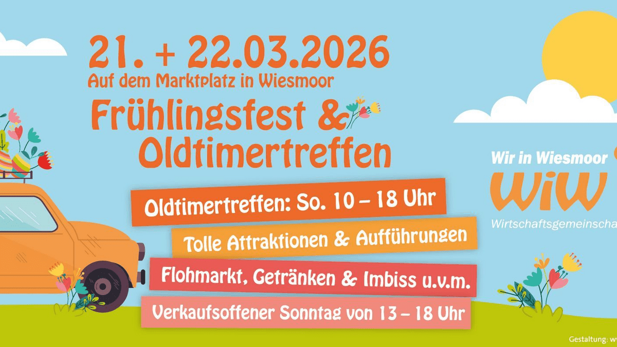 Am 21. und 22. März 2026 lädt die Wirtschaftsgemeinschaft auf dem Marktplatz Wiesmoor zum bunten Frühlingsfest ein. Freuen Sie sich auf ein Oldtimertreffen am Sonntag (10–18 Uhr), einen Flohmarkt, tolle Attraktionen, Aufführungen sowie Getränke und Imbissangebote. Zudem ist am Sonntag von 13–18 Uhr verkaufsoffen.