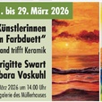 Diese Ausstellung präsentiert Werke von Brigitte Swart und Barbara Voskuhl.  Die zumeist landschaftlich geprägten Malmotive von Brigitte Swart entstanden nach eigenen Fotografien ihrer Reisen in unterschiedliche Länder dieser Welt. Ihre Emotionen in der Natur finden sich farbenfroh auf der Leinwand mit Acryltechnik wieder. Barbara Voskuhl entwickelt in einer verlaufsorientierten Herangehensweise ihre experimentellen und abstrakten Werke. Ihre Bilder und Keramiken gestaltet sie in freier Form, mit kraftvollen Strukturen und Farben. Beide Künstlerinnen schaffen in dieser Ausstellung eine eindrucksvolle Verbindung verschiedener künstlerischer Ausdrucksformen, die dazu einlädt, innezuhalten, den Blick zu schärfen und neue Sichtweisen zu entdecken.