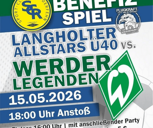 Das wird unser Moment! Direkt nach Vatertag schreiben wir Geschichte. Zum 70-jährigen Jubiläum holen wir Werder-Legenden auf unsere Sportanlage nach Langholt. Echte Stars. Echte Bundesligaprofis. Echte Fußballmomente – und sie kommen zu UNS! Dieses Benefizspiel ist mehr als nur Fußball: Es soll ein Zeichen sein, was für eine Gemeinschaft Langholt sein kann. Der Überschuss geht an unsere SCR-Jugend und an Flugkraft. Wir setzen uns für Kinder ein und unterstützen den Kampf gegen Krebs. Im Anschluss feiern wir die große SCR-Fete – mit Musik, Tanz und Spaß für alle.