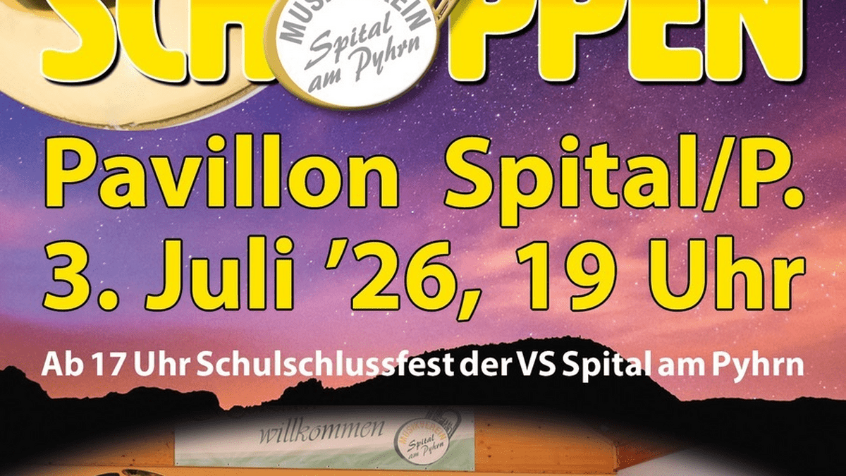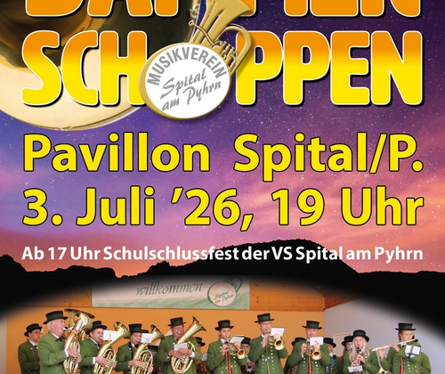 Der Musikverein Spital am Pyhrn freut sich, Sie zum Dämmerschoppen im Pavillon einzuladen. Genießen Sie eine gesellige Atmosphäre und lassen Sie sich kulinarisch verwöhnen. Das Schulschlussfest der Volksschule Spital am Pyhrn beginnt um 17 Uhr und verspricht Spaß für die ganze Familie. Kommen Sie vorbei und feiern Sie mit uns einen unvergesslichen Abend voller Musik und guter Stimmung.