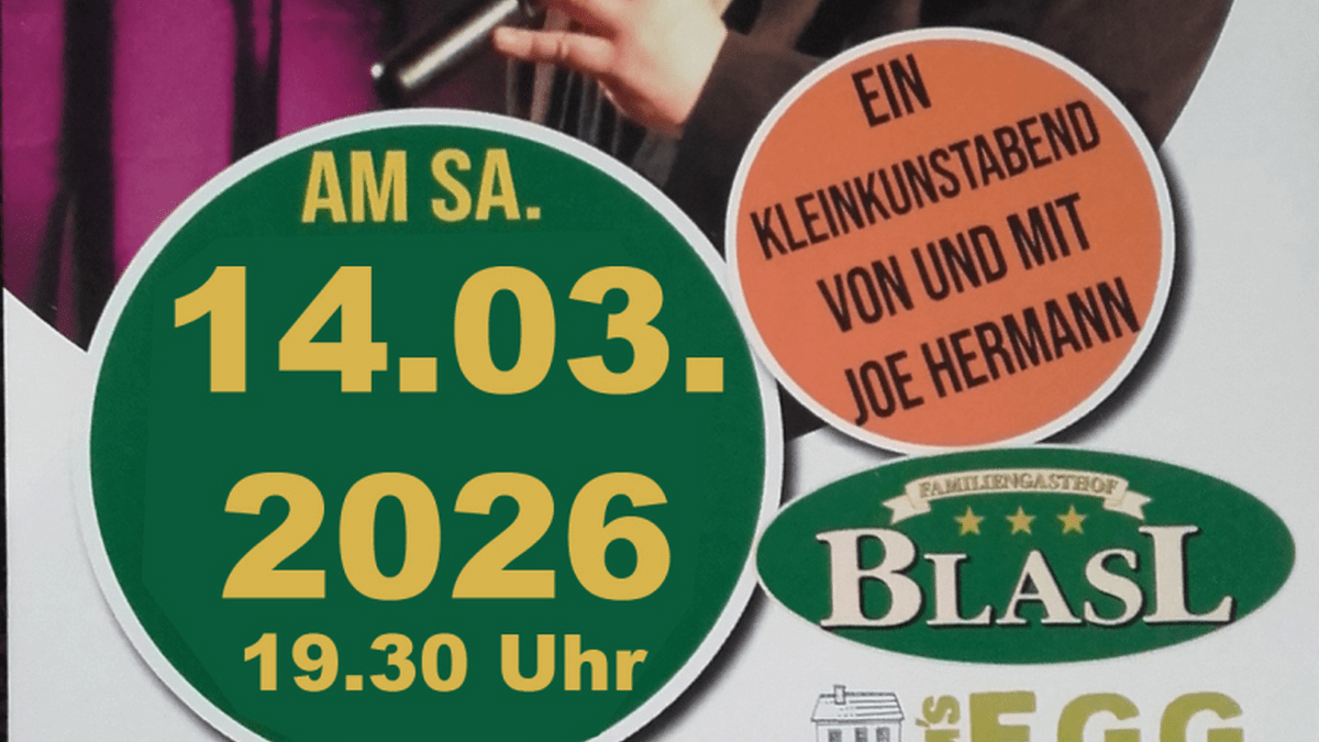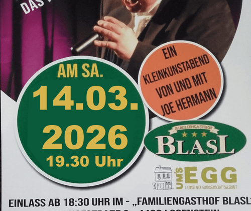 Joe Hermann verbindet Musik, Gesang, und Entertainment, um Alltagswahnsinn und Politik aufs Korn zu nehmen.Ein musikalischer Abend mit Humor und bekannten Weltsongs.Lehnen sie sich zurück und genießen Sie einen abwechslungsreichen Abend.Küche im Gasthof Blasl ab 16°° Uhr.