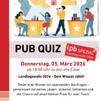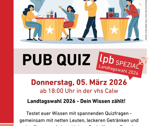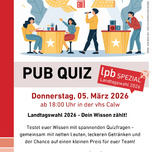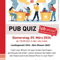 Im Rahmen unseres PubQuizzes beschäftigen wir uns mit vielen Facetten unseres Bundeslandes, wobei nicht nur Allgemeinwissen sondern auch Kreativität und Kombinationsfähigkeit gefragt sind. Kennen Sie den Amtssitz des Ministerpräsidenten? Wissen Sie was in Baden-Württemberg alles erfunden wurde? Oder sind Sie mit den städtischen Festivitäten im Ländle vertraut? Im Rahmen unseres PubQuizzes beschäftigen wir uns mit vielen Facetten unseres Bundeslandes, wobei nicht nur Allgemeinwissen sondern auch Kreativität und Kombinationsfähigkeit gefragt sind. Neben Wissenswertem zu Landtagswahl und Landespolitik können Fragen zu Geschichte, Geografie und Kultur ebenso auf dem Programm stehen wie kuriose Schätzfragen oder Aufgaben zu Sport, Wirtschaft und unglaublichen Ortsnamen in Baden-Württemberg. Die Veranstaltung findet in Kooperation mit der Landeszentrale für politische Bildung Baden-Württemberg statt.