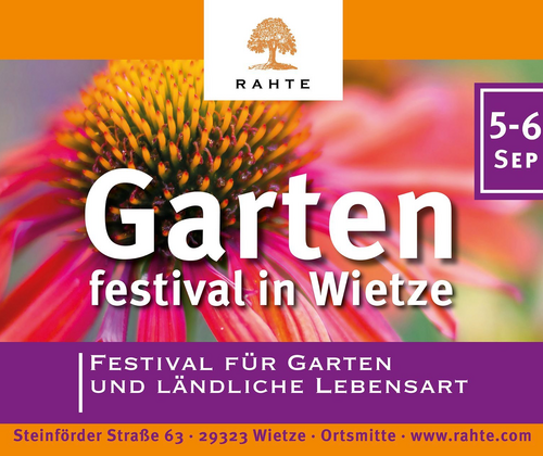 Bereits zum 16. Mal findet Anfang September (05.09 - 06.09.2026) auf der großzügigen und attraktiv gestalteten Hofanlage der Familie Rahte in Wietze, Steinförder Straße 63, unser Gartenfestival statt. Es wird - wie in den letzten Jahren - ein stimmungsvolles und spätsommerliches Fest mit Handwerk, Kunst und Design, Gartenbau, Dekoration, Wohnaccessoires, Mode, Schmuck und vielem mehr. In historischen Stallgebäuden und in einer reizvollen Garten- und Parkanlage finden mehr als 80 Aussteller Platz, um ihre Ideen zu präsentieren. Livemusik und Kinderunterhaltung bilden ein abgestimmtes Rahmenprogramm.