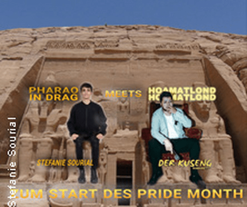"In der Kulisse startet die Pride-Saison am 2. Juni mit Kabarett und Konfetti! Ein Abend, eine Bühne, zwei Performer. In der ersten Hälfte präsentiert Stefanie Sourial "Pharao in Drag". Große Gesten, alte Macht und neue Glitzerordnung. Zwischen Antike und Gegenwart trifft die Regenbogenparade auf Burschenschaftsbude. Eine geschichtlich-politische, mythologische absurde Reise durch Raum und Pride. Herrschaft wird hier neu geschminkt und gespielt.