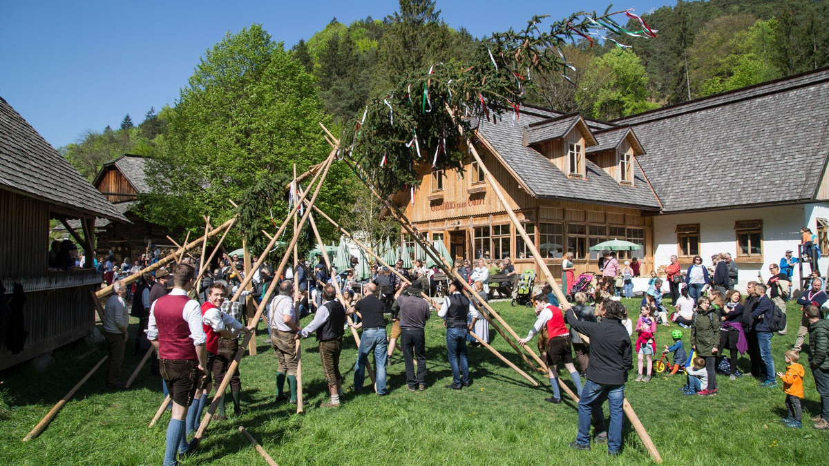 Wenn der Frühling ins Tal zieht, wird es lebendig im Österreichisches Freilichtmuseum Stübing. Beim Fest „Auf in den Frühling!“ am 1. Mai 2026 stehen alte Bräuche, Musik und Handwerk im Mittelpunkt. Zwischen historischen Bauernhäusern aus ganz Österreich zeigt sich, wie in der Steiermark früher gefeiert wurde.Höhepunkt ist das traditionelle Maibaumaufstellen auf dem Dorfplatz. Mit Muskelkraft und langen Stangen wächst der geschmückte Baum Stück für Stück in die Höhe. Dazu erklingen Volksmusik und fröhliche Tänze. Kinder probieren sich beim Maibaumkraxeln oder bei alten Spielen, die sonst kaum noch zu sehen sind.