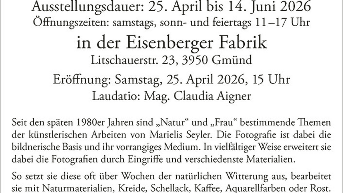 Ausstellung Marielis Seyler »Momentum Natur« in der Eisenberger Fabrik in Gmünd 15:00 Uhr