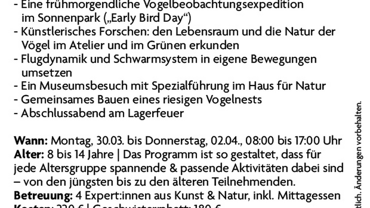 Solektiv lädt Kinder und Jugendliche zu vier kreativen Tagen rund um die faszinierende Welt der Vögel ein. Beim Birdcamp wird geforscht, beobachtet und gestaltet. Es warten Experimente im Klimaforschungslabor, der Bau eines riesigen Vogelnests, künstlerisches Arbeiten im Atelier, eine Museums-Spezialführung zum Thema Vögel, und ein Lagerfeuer-Abschlussabend.