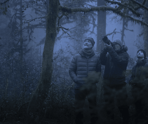 Mit Rucksack, Stock und einer warmen Jacke ausgestattet, zieht es ihn immer wieder tief hinein in die Stille des Waldes, zu einem ganz besonderen Ort: einer Tanne, die zu seinem Versteck geworden ist. Unter ihren Ästen scheint der alte Mann mit der Natur zu verschmelzen. Über achthundert Nächte hat er dort verbracht, lauschend, beobachtend – immer auf der Suche nach Füchsen, Rehen, Hirschen, Luchsen und dem geheimnisvollen König der Wälder: dem Auerhahn.