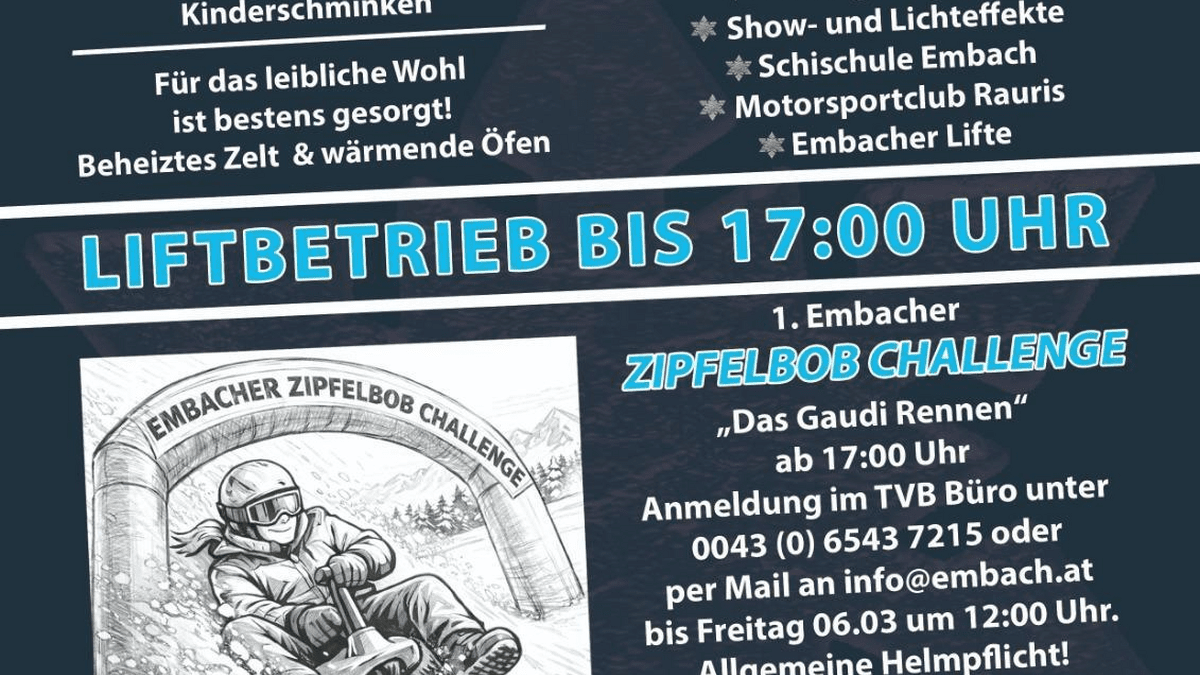 Die Anmeldung ist im TVB-Büro unter +43 6543 7215 oder per Mail an info@embach.at bis Freitag, 06.03., 12.00 Uhr möglich.