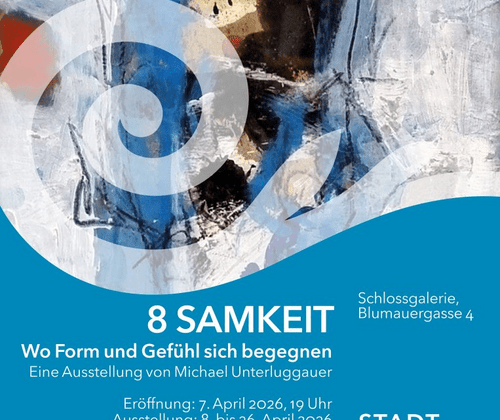 Ausstellung: 8. April bis 26. April 2026Öffnungszeiten:Di-Fr:10–13 UhrDi, Do, Fr 13:30–17 UhrSa-So: 10–17 UhrDer Künstler ist von Freitagnachmittag bis Sonntag anwesend.Eintritt frei! Am 7. April 2026, 19 Uhr eröffnet Vizebürgermeister Dr. Michael Schodermayr die Ausstellung „8 SAMKEIT“ des österreichischen Künstlers Michael Unterluggauer. Der Maler wurde 1953 in Lienz geboren. 2015 übersiedelte er von Osttirol nach Oberösterreich, wo er heute in der Nähe von Linz lebt und in seinem Atelier wirkt.Seine rege Ausstellungstätigkeit vor allem in Österreich, aber auch in Italien und der Schweiz, führt ihn 2026 nach Steyr. Seit über fünf Jahrzehnten beschäftigt sich der ehemalige Lehrer und Kunsterzieher mit vielfältigen künstlerischen Techniken mit einem zentralen Thema: das menschliche Miteinander. In der Schlossgalerie werden abstrakte und gegenständliche Beziehungsbilder präsentiert. Im Zentrum stehen Darstellungen von Menschen und Formen in Beziehungen zueinander. Die Bilder bewegen sich zwischen Figur und Auflösung, zwischen Körper und Farbform. Die Malerei Unterluggauers sucht nicht das Erzählerische, sondern macht sichtbar, was dem Maler zeitlos wertvoll erscheint. „Als Künstler verbinde ich Malerei mit emotionaler Intelligenz, um Werke zu schaffen, die berühren“, so Michael Unterluggauer über seine Arbeit. Anlässlich der Ausstellung in Steyr fertigte der Künstler eigens Bilder mit Steyrer Motiven an.Nähere Infos: www.unterlu1.info