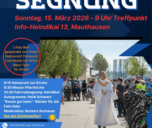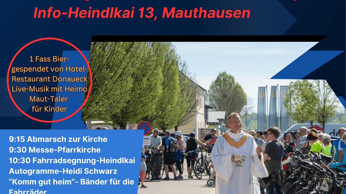 Am Sonntag, 15. März 2026 treffen wir uns um 9:00 Uhr beim Info-Heindlkai 13.Ablauf:9:15 Abmarsch zur Kirche9:30 Messe in der Pfarrkirche10:30 Fahrradsegnung am HeindlkaiHighlights:Autogramme von Heidi Schwarz„Komm gut heim“ Bänder für dein RadLive-Musik mit Heimo