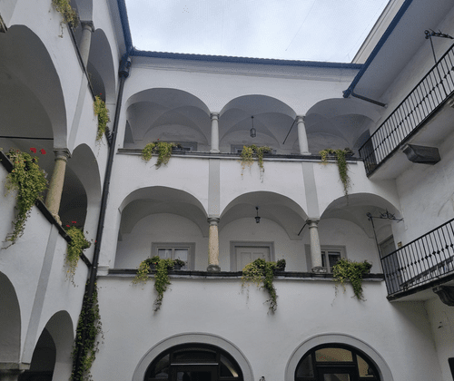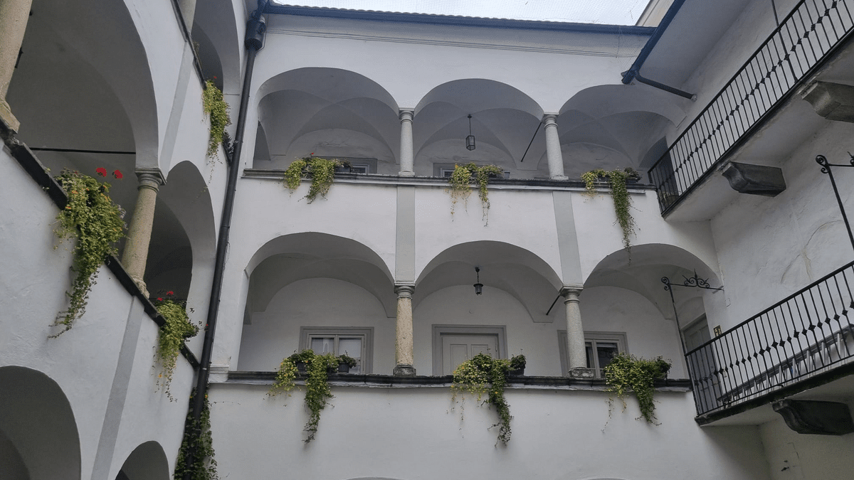 Unsere Tour startet ganz unscheinbar – und genau darin liegt der Zauber. Nur ein paar Meter abseits der Straße zeige ich dir einen kaum bekannten Teil des ältesten Linz: In einem versteckten Hinterhof entdeckst du einen zirka 1000 Jahre alten Rest der Linzer Stadtmauer. Danach betreten wir einen wunderschön italienisch anmutenden Renaissance-Innenhof, der von Weltgeschichte und Wohlstand erzählt.