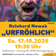 Warum urfröhlich sein vielleicht der richtige Weg in das letzte Drittel des Lebens ist. Ein Kabarett-Programm über die überraschende Erkenntnis, dass Fröhlichkeit manchmal die klügere Entscheidung ist. „URFRÖHLICH" ist ein Programm für alle, die lieber über die Probleme von Reinhard Nowak lachen als über ihre eigenen – denn er erleidet stellvertretend für uns alles - jedes Gfrett - alles urfröhlich. Freie Platzwahl!