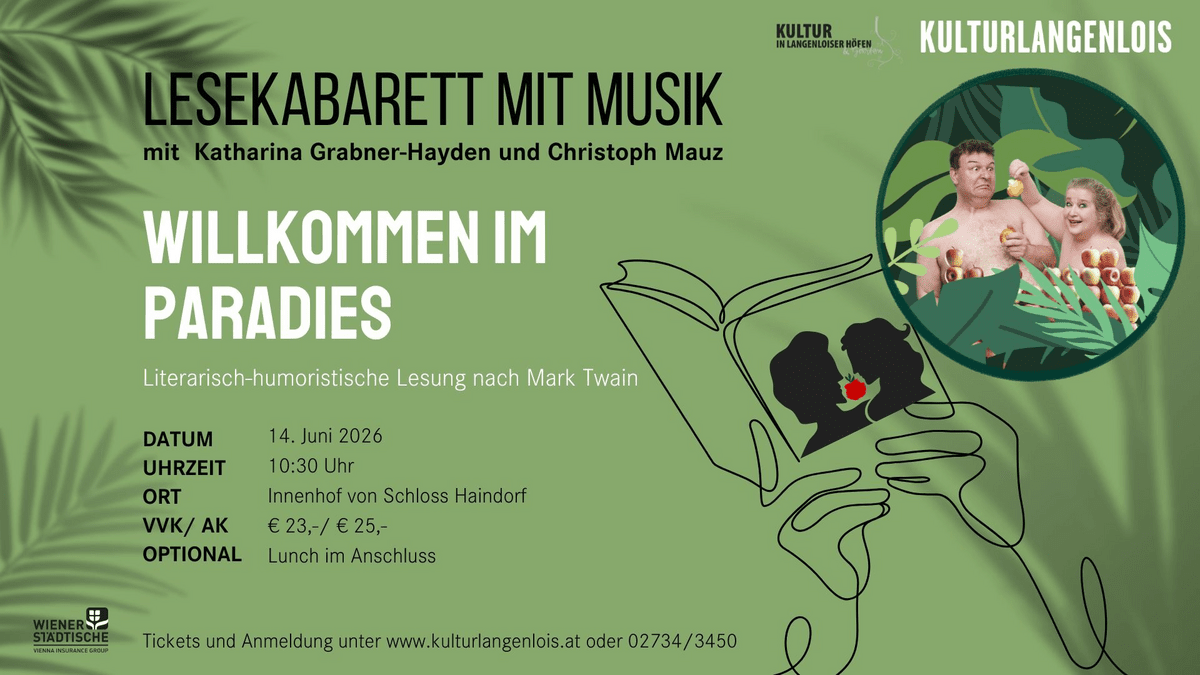 Die bekannten und beliebten Autoren Katharina Grabner-Hayden und Christoph Mauz haben sich die Frage gestellt und sich in das Tagebuch von Adam und Eva vertieft. In ihrer kabarettistischen Lesung " Willkommen im Paradies" entführen sie das Publikum zurück zu den Anfängen der Menschheit, in die Genesis. Das Ende ist klar: Gott und eine listige Influencerin verhelfen den beiden über ihre Unzulänglichen hinwegzusehen und alles findet schließlich doch zu einem Happy End! Auch wenn Adam und Eva dafür in den sprichwörtlichen sauren Apfel beißen müssen.