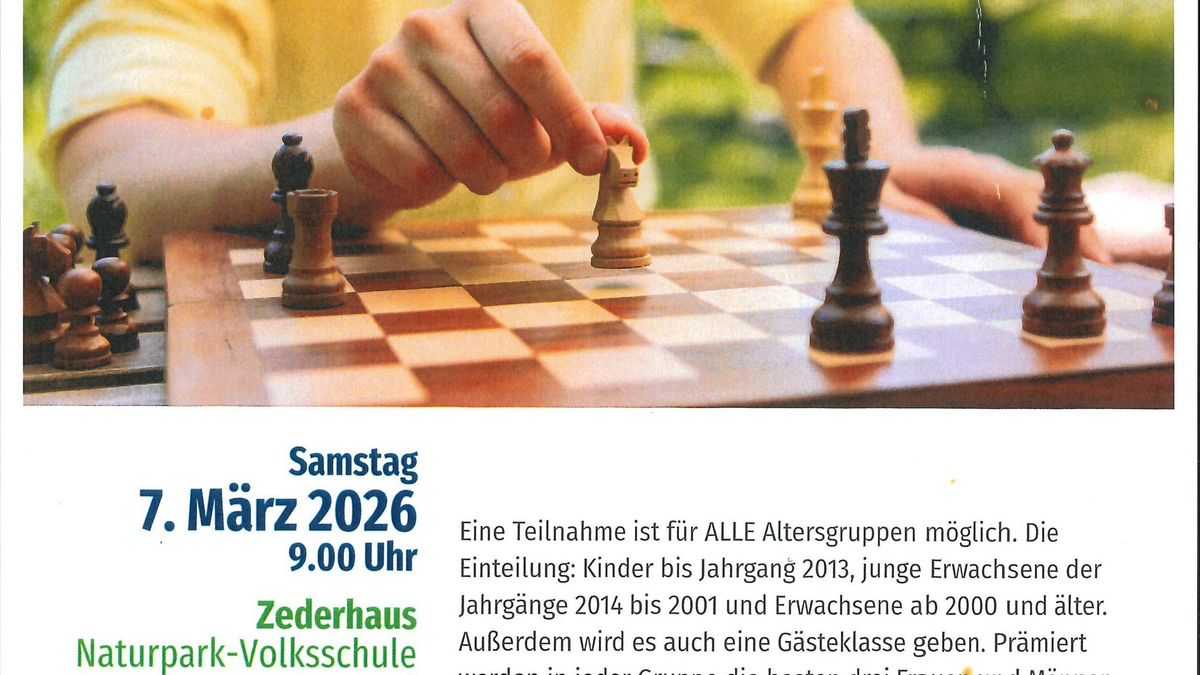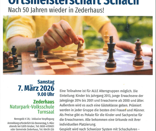 Alle Schachfreunde sind herzlich eingeladen bei dem Schachturnier mit zu spielen!Die Teilnahme ist für alle Altersgruppen möglich Einteilung: Kinder bis Jahrgang 2013, junge Erwachsene der Jahrgänge 2012 bis 2001 und Erwachsene ab 2000 und älter. Außerdem wird es auch eine Gästeklasse geben. Prämiert werden in jeder Gruppe die besten drei Frauen und Männer. Als Preise gibt es Pokale für die Kinder und Sachpreise für die Erwachsenen. Alle bekommen eine Urkunde mit ihrer individuellen Platzierung Gespielt wird nach Schweizer System mit Schachuhren - 30 Minuten Zeit für eine Partie. Verpflegung vom Gasthaus Kirchenwirt und der Bibliothek. Nenngeld: 20.- Euro, inkl. Verpflegung Anmeldung erforderlich bis Donnerstag, 5. März abends bei Edith Gruber, Tele: 0650 4159651 oder bei der Gemeinde Zederhaus, Tel: 06478 226