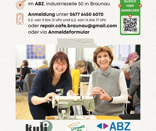 9:00–13:00 UhrDas Repair Café Braunau ist eine ehrenamtliche Initiative, bei der Menschen ihre defekten Geräte oder Alltagsgegenstände mitbringen können, um sie kostenlos gemeinsam mit erfahrenen Reparaturhelfer:innen zu reparieren.Die Idee dahinter:Ressourcen schonen – Dinge nicht wegwerfen, sondern reparieren