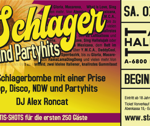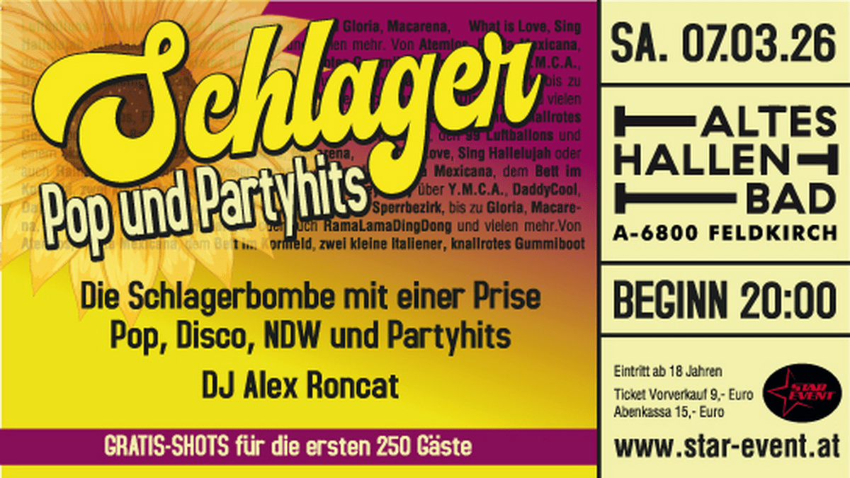 Also rein ins Schlagerkostüm oder die Partyklamotten und ab ins ALTE HALLENBAD nach FELDKIRCH.