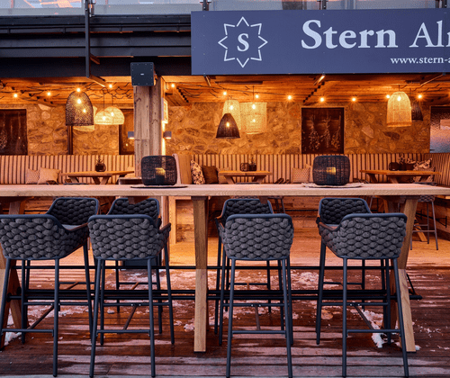 Coole Drinks und lässige Stimmung! Die SternAlm Lounge - gemütlicher Aprés Ski direkt an der Talabfahrt im Alpendorf.