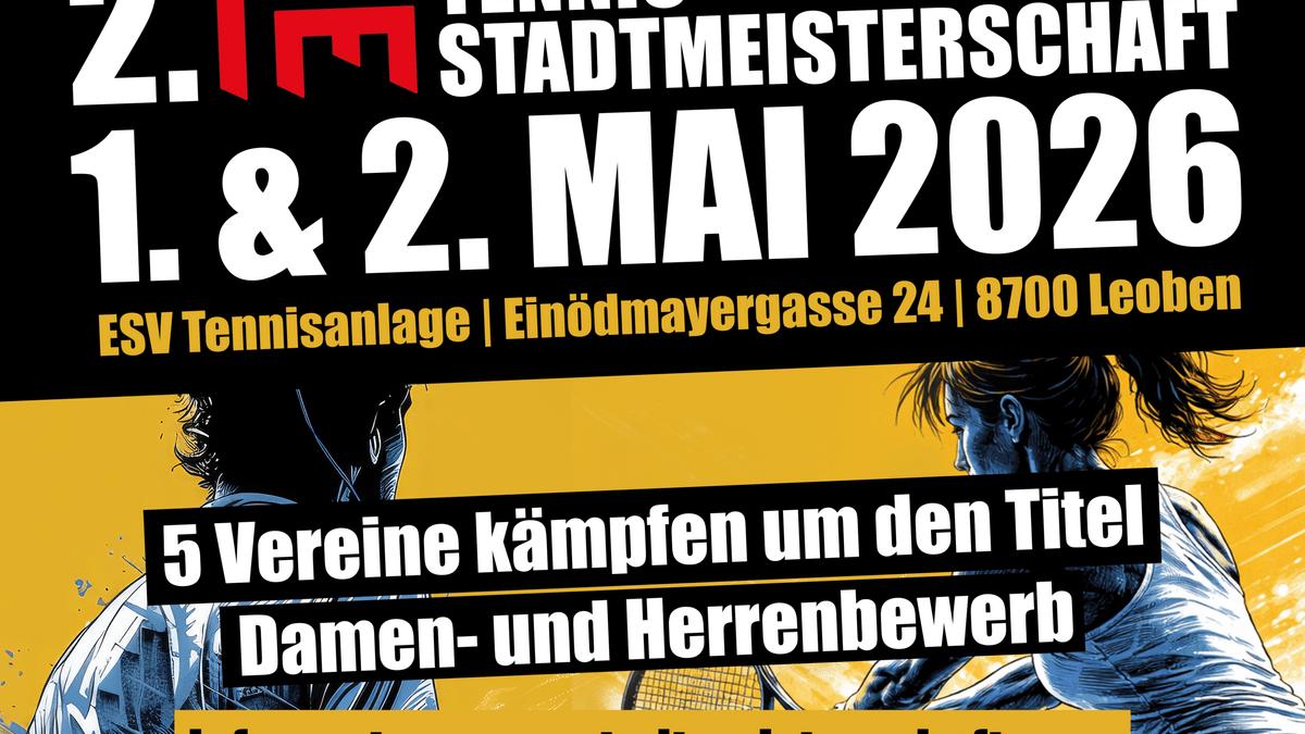 Nach der erfolgreichen Erstauflage lädt die Sektion Tennis des ESV Leoben im Jahr 2026 zur zweiten LE Stadtmeisterschaft ein. Neu im Jahr 2026 ist ein eigener Damenbewerb, in dem erstmals die LE Stadtmeisterin gekürt wird. Zuschauerinnen und Zuschauer aller Altersgruppen sind herzlich eingeladen, an diesen 2 Tagen bei den spannenden Matches mitzufiebern. Die Finalspiele finden am 2. Mai ab ca. 14:30 Uhr statt. Im Anschluss folgen Siegerehrung, Tombola und Abschlussparty mit Livemusik.