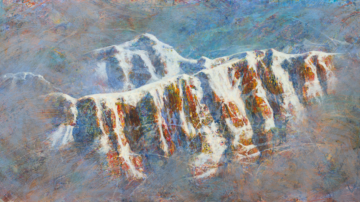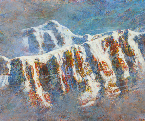 Die Gebirge in der Malerei von Thomas Bredenfeld bilden keine realen Landschaften ab. Sie sind nicht erfunden, sondern entstehen aus malerischen Prozessen und bauen sich aus Pinselstrichen, abstrakten Mustern, Texturen und Farbspritzern auf. Von der Ferne betrachtet muten Sie realistisch an. Geht man aber näher ans Bild, offenbart sich ein kräftiges, farbiges Geflecht aus purer Malerei. Als Referenz für die Glaubhaftigkeit von Topografie und Lichtstimmungen in seinen Hochgebirgslandschaften dienen Thomas Bredenfeld einige Jahrzehnte als Bergsteiger in den Österreichischen und den Schweizer Alpen.