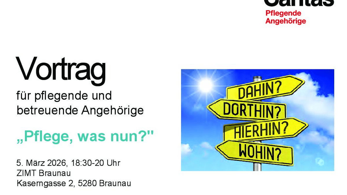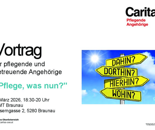 Beginn: 18:30 UhrInformationsveranstaltung rundum das Thema Betreuung und Pflege von Angehörigen.Statistisch gesehen ist in Österreich fast jede vierte Familie im Laufe ihres Lebens einmal mit einer Betreuungs- oder Pflegesituation konfrontiert. Es kann helfen, wenn Sie bei bereits bei Eintritt eines Pflegefalles gut informiert sind, um im Bedarfsfall rasch reagieren zu können.An diesem Abend werden diese und weitere Fragen zu wesentlichen Unterstützungsleistungen in der Pflege und Betreuung geklärt. Und Sie erfahren auch, welche Angebote und Anlaufstellen es speziell für betreuende und pflegende Angehörige im Bezirk Braunau gibt. Zudem gibt es Infos zum Thema Pflegegeld und zu Möglichkeiten zur Vereinbarung von häuslicher Pflege und Erwerbstätigkeit.