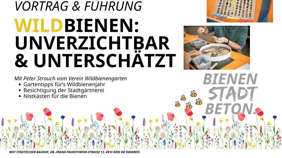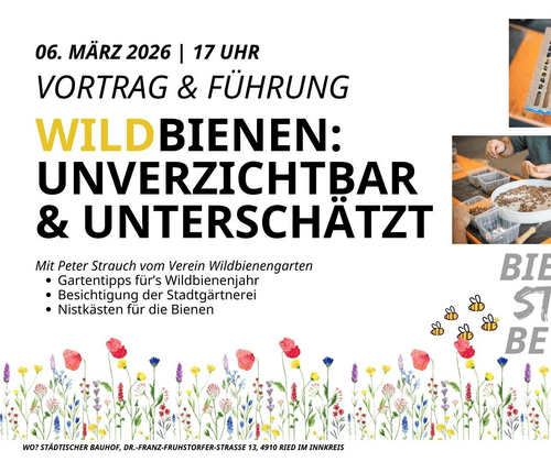 Die Stadtgemeinde Ried im Innkreis lädt am 06. März herzlich um 17 Uhr zu einem spannenden Nachmittag rund um das Thema Wildbiene ein. Die unterschätzten und vor allem aber unverzichtbaren Bestäuberinnen sind essentiell für das Ökosystem. Bereits bei 3-4 Grad fangen sie an zu arbeiten und bestäuben über 80% aller Obstbäume - und dabei sind sie übrigens keine Konkurrentinnen zur normalen Biene! Peter Strauch vom Verein Wildbienengarten wird in seinem Vortrag auf ihre Bedeutung eingehen, Einblicke in das Wildbienenjahr geben und praktische Tipps für den eigenen Garten. Zuvor gibt es eine Führung durch die Stadtgärtnerei sowie Praxiswissen für optimale Bepflanzung. Vor Ort können außerdem auch Nistkästen für Wildbienen vom Verein erworben werden. Treffpunkt ist direkt am Städtischen Bauhof, Dr.-Franz-Fruhstorfer-Straße 13, 4910 Ried im Innkreis. Ausreichend kostenfreie Parkmöglichkeiten gibt es vor Ort.