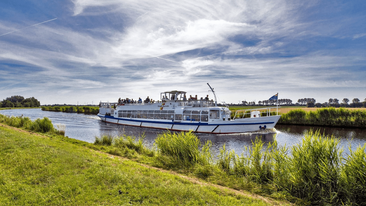 Fernab von Stress und Autoverkehr auf dem Ems-Jade-Kanal mit dem Fahrgastschiff MS Stadt Aurich. Aurichs Uferpromenade begleitet das Schiff beim Verlassen des Hafens gleich hinter der ersten Brücke. Nach kurzer Zeit gelangt es in die Schleuse "Kukelorum", wo es von 3,70 Meter über NN auf 2,70 Meter über NN abgesenkt wird. Das Kanalbett verläuft wesentlich höher, als seine wiesenreiche Umgebung. Dieser erhabene Ausblick verschafft oft unvermutet Blickkontakt zu seltenen Wasservögeln oder zu Schaf- und Pferdeherden. Nach dem Passieren der Fahnster Brücke sehen Sie die einzig noch betriebene Werft am Ems-Jade-Kanal. Im Ihlower Ortsteil Bangstede wendet das Schiff und erreicht nach 2 1/2 Stunden Fahrt wieder den Auricher Hafen. Für das leibliche Wohl an Bord sorgt das Gastronomie-Team der MS Stadt Aurich. Abfahrt: 14:00 Uhr, Auricher Hafen (Hasseburger-/Ecke Tannenbergstraße). Hin- und Rückfahrt dauern 2 1/2 Stunden. Weitere Informationen beim Verkehrsverein Aurich unter 04941/4464. Kosten: Erwachsene  21,00 € Kinder             9,00 € Kaffee/Tee und Kuchen 9,50 € pro Person
