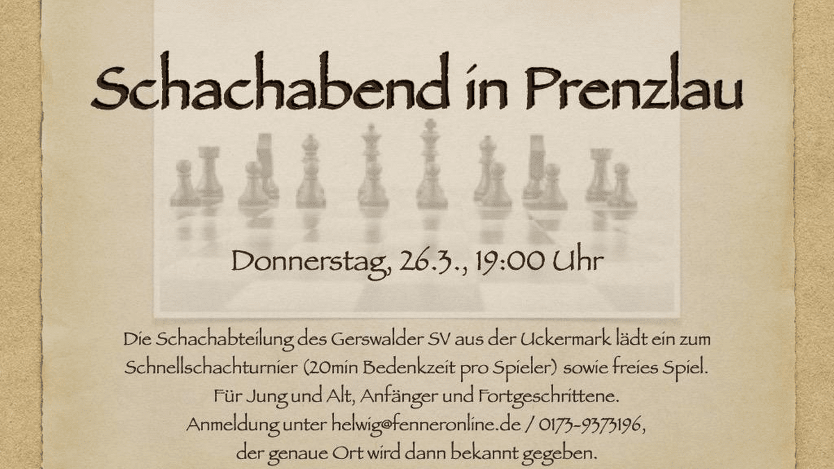 Freies Spiel für Jung und Alt, Anfänger und Fortgeschrittene. Es wird auch ein Schnellschachturnier mit 20min Bedenkzeit pro Spieler ausgetragen. Anmeldung erforderlich unter: 0173-9373196 oder [helwig@fenneronline.de](mailto:helwig@fenneronline.de)