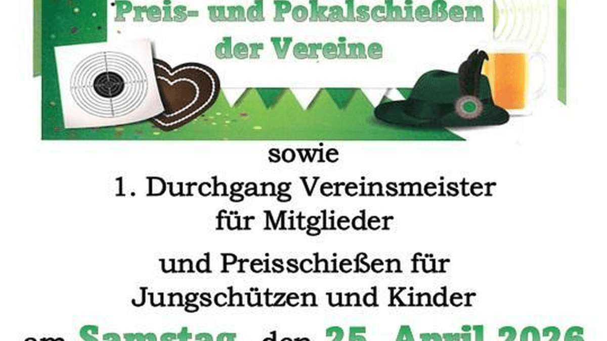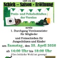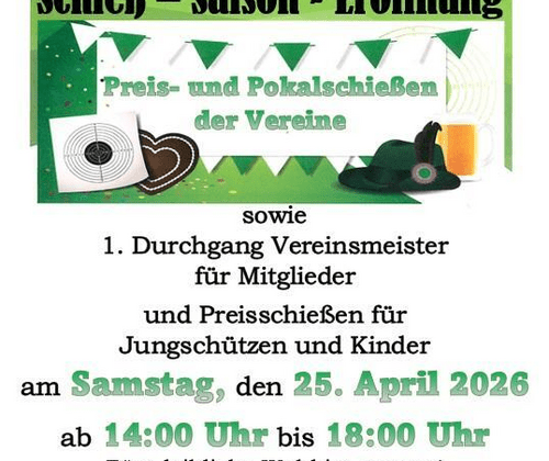 Unsere Schieß-Saison 2026 wird Eröffnet wie in jedem Jahr. Wir beginnen wieder mit unserem Preis- und Pokalschießen der Vereine sowie dem 1. Durchgang des Vereinsmeisterschießens für Mitglieder. Aber auch Preisschießen für Jungschützen und Kinder wird es wieder geben. Von 14:00 bis 18:00 Uhr freuen wir uns auf euch und fürs leibliche Wohl ist natürlich auch gesorgt. Schaut vorbei...