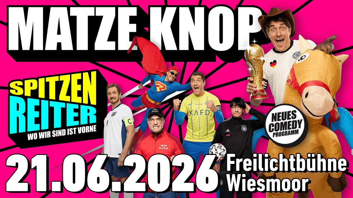 Matze Knop – Spitzenreiter SPITZENREITER so heißt das brandneue Bühnenprogramm von Matze Knop. Zusammen mit seinem neuen Pferdebuddy reitet er wagemutig durch den Wahnsinn unseres Alltags. All den Tücken und Herausforderungen in diesen verrückten Zeiten stellt Matze sich in seiner bekannten humorvollen und ironischen Art. Denn: Wer lacht, führt! Und wo wir sind ist vorne! Sei dabei!