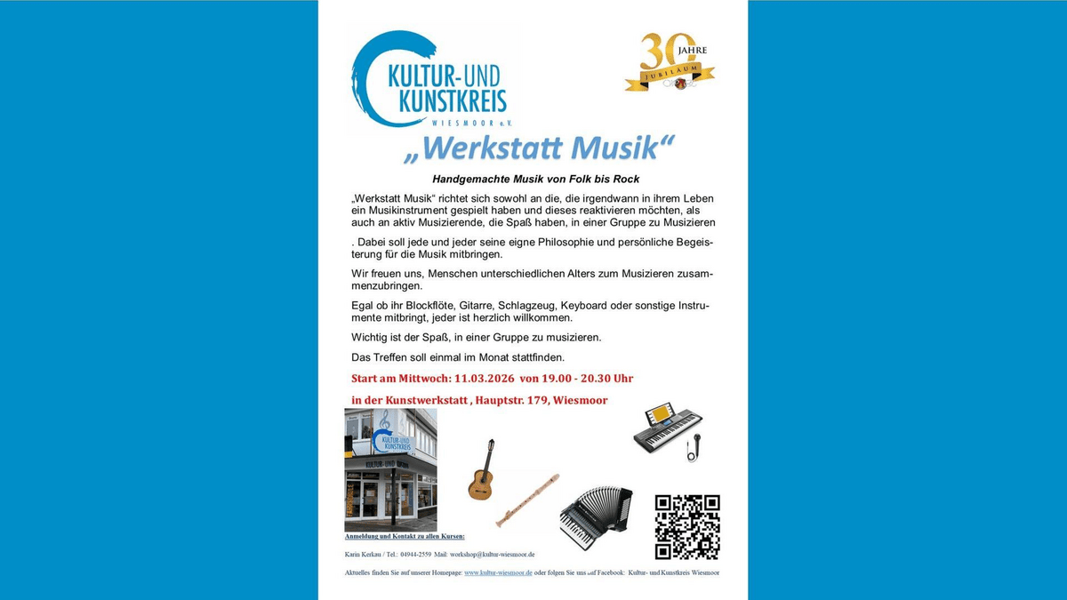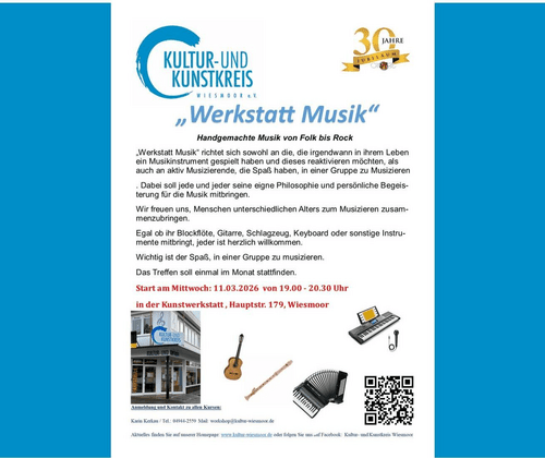 "Werkstatt Musik" richtet sich sowohl an die, die irgendwann in ihrem Leben ein Musikinstrument gespielt haben und dieses reaktivieren möchten, als auch an aktiv Musizierende, die Spaß haben, in einer Gruppe zu Musizieren. Dabei soll jede und jeder seine eigene Philosophie und persönliche Begeisterung für die Musik mitbringen.  Wir freuen uns, Menschen unterschiedlichen Alters zum Musizieren zusammenzubringen. Egal ob ihr Blockflöte, Gitarre, Schlagzeug, Keyboard oder sonstige Instrumente mitbringt, jeder ist herzlich willkommen.  Wichtig ist der Spaß in einer Gruppe zu musizieren. Das Treffen soll einmal in Monat stattfinden. Start am Mittwoch 11.03.26 von 19 bis 20.30 Uhr in der Kunstwerkstatt Anmeldung und Kontakt zu allen Kursen: Karin Kerkau  Tel.: 04944-2559 Mail: workshop@kultur-wiesmoor.de