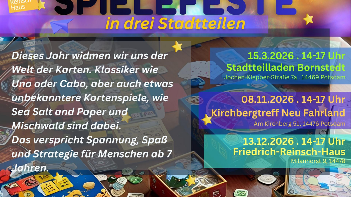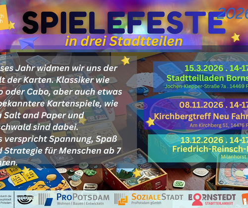 Dieses Jahr widmen wir uns der Welt der Karten. Klassiker wie Uno oder Cabo, aber auch etwas unbekanntere Kartenspiele, wie Sea Salt and Paper und Mischwald sind dabei. Das verspricht Spannung, Spaß und Strategie für Menschen ab 7 Jahren. Mit freundlichen Grüßen Sten Biedermann Projektentwicklung Tel 015201583660 Soziale Stadt ProPotsdam gGmbH Milanhorst 9 14478 Potsdam